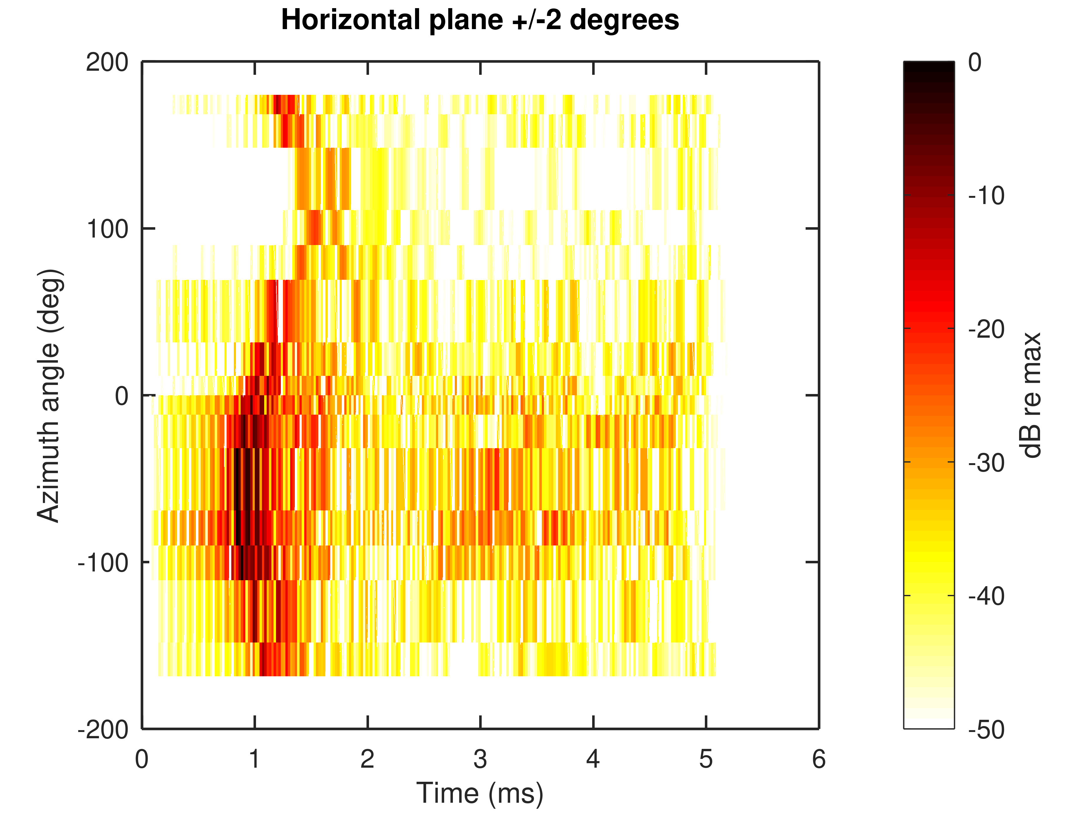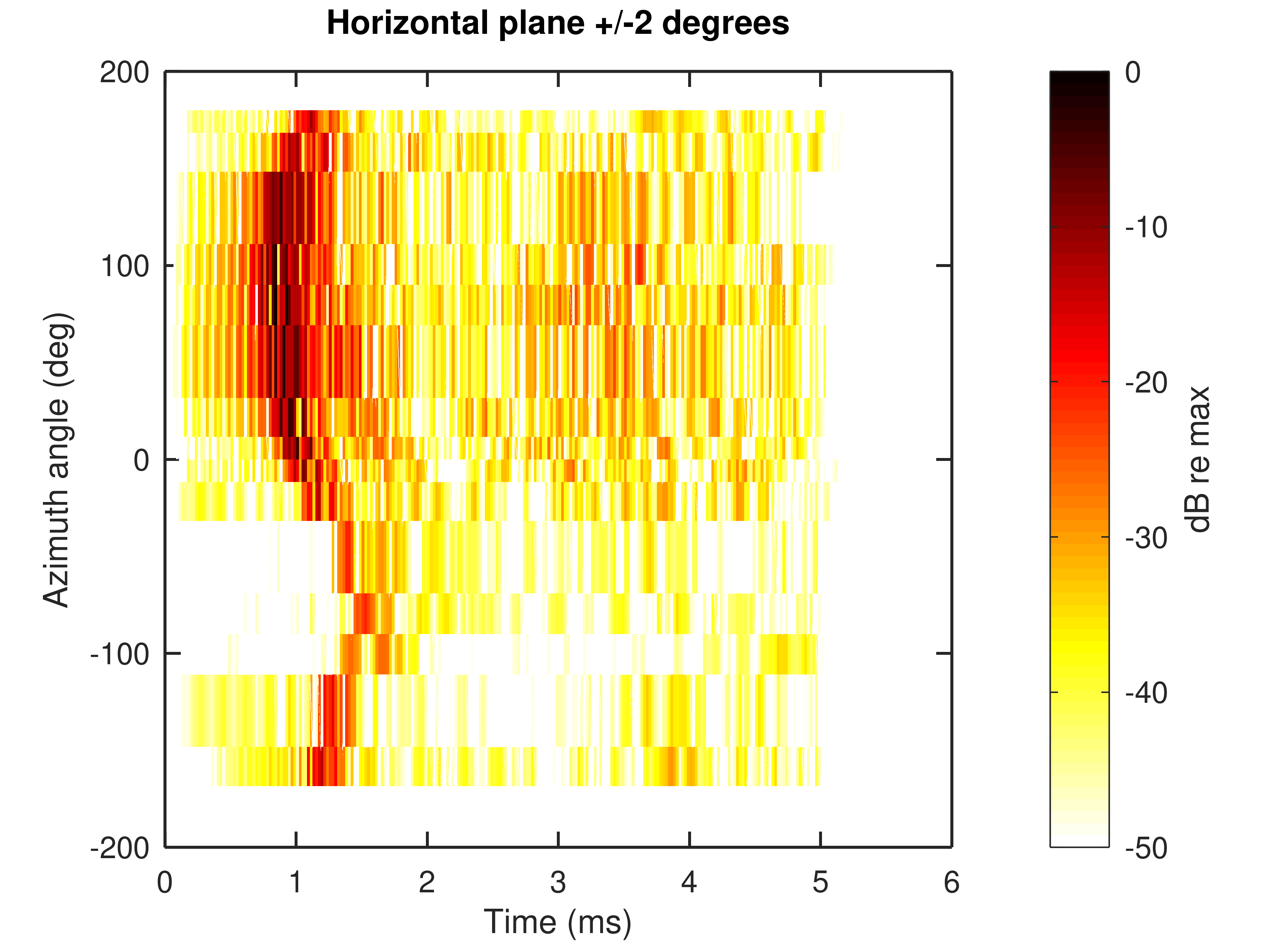 | Note: Sums of squared IRs at receivers (coloured dots) when one emitter is active (blue cross). The position of the in-ear microphone is indicative only as the actual position has not been recorded. |