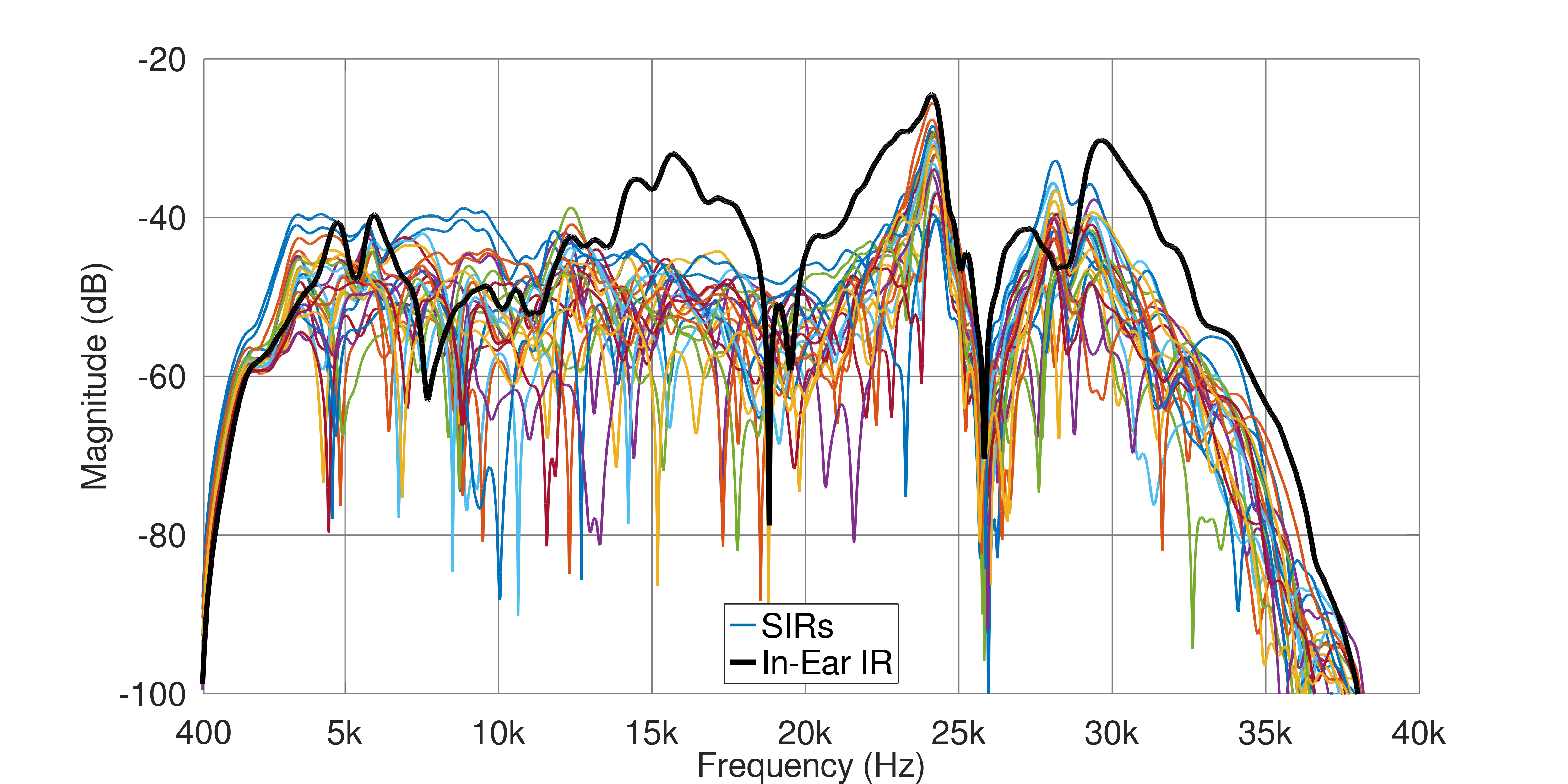 | Note: Sums of squared IRs at receivers (coloured dots) when one emitter is active (blue cross). The position of the in-ear microphone is indicative only as the actual position has not been recorded. |