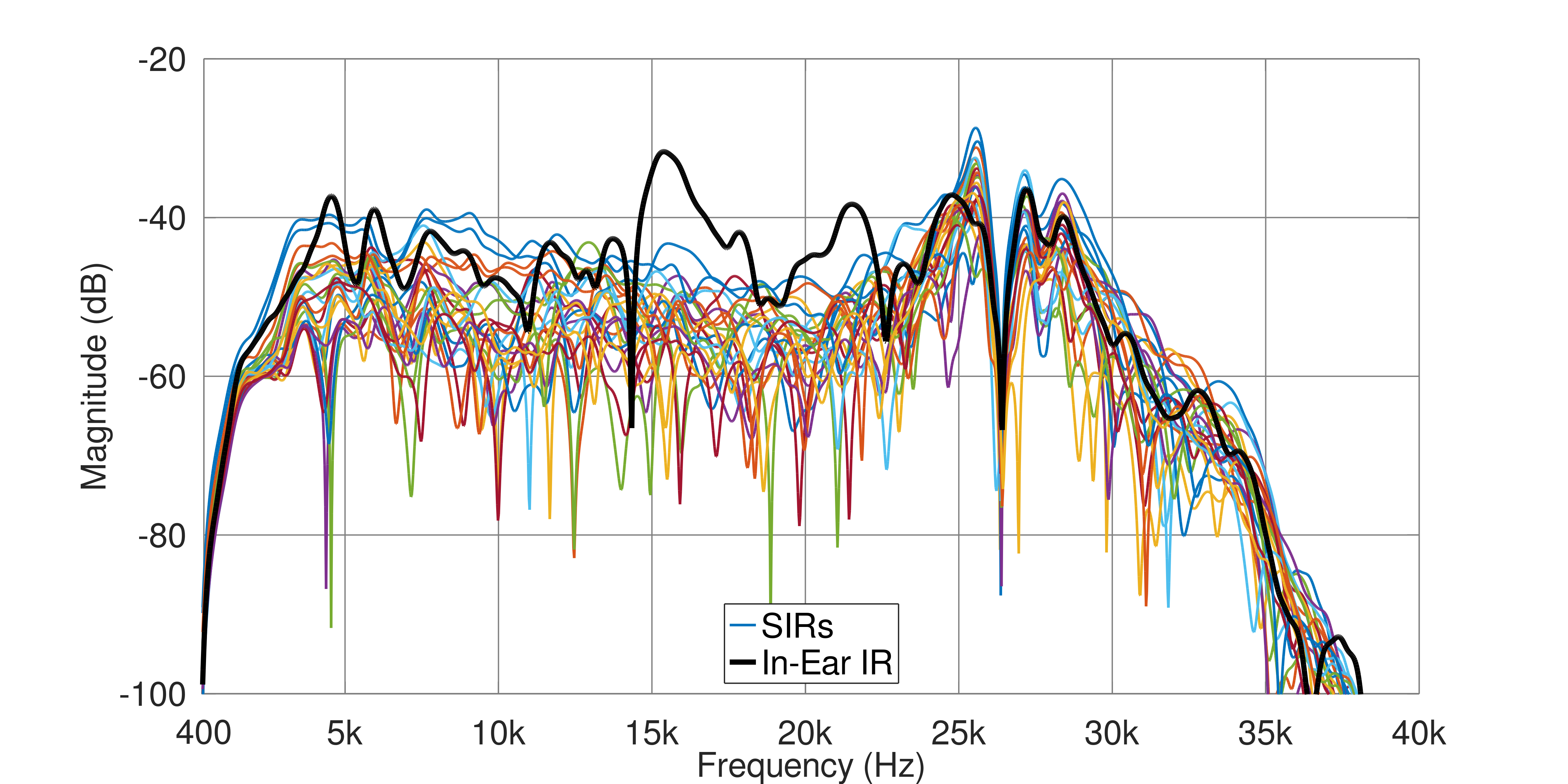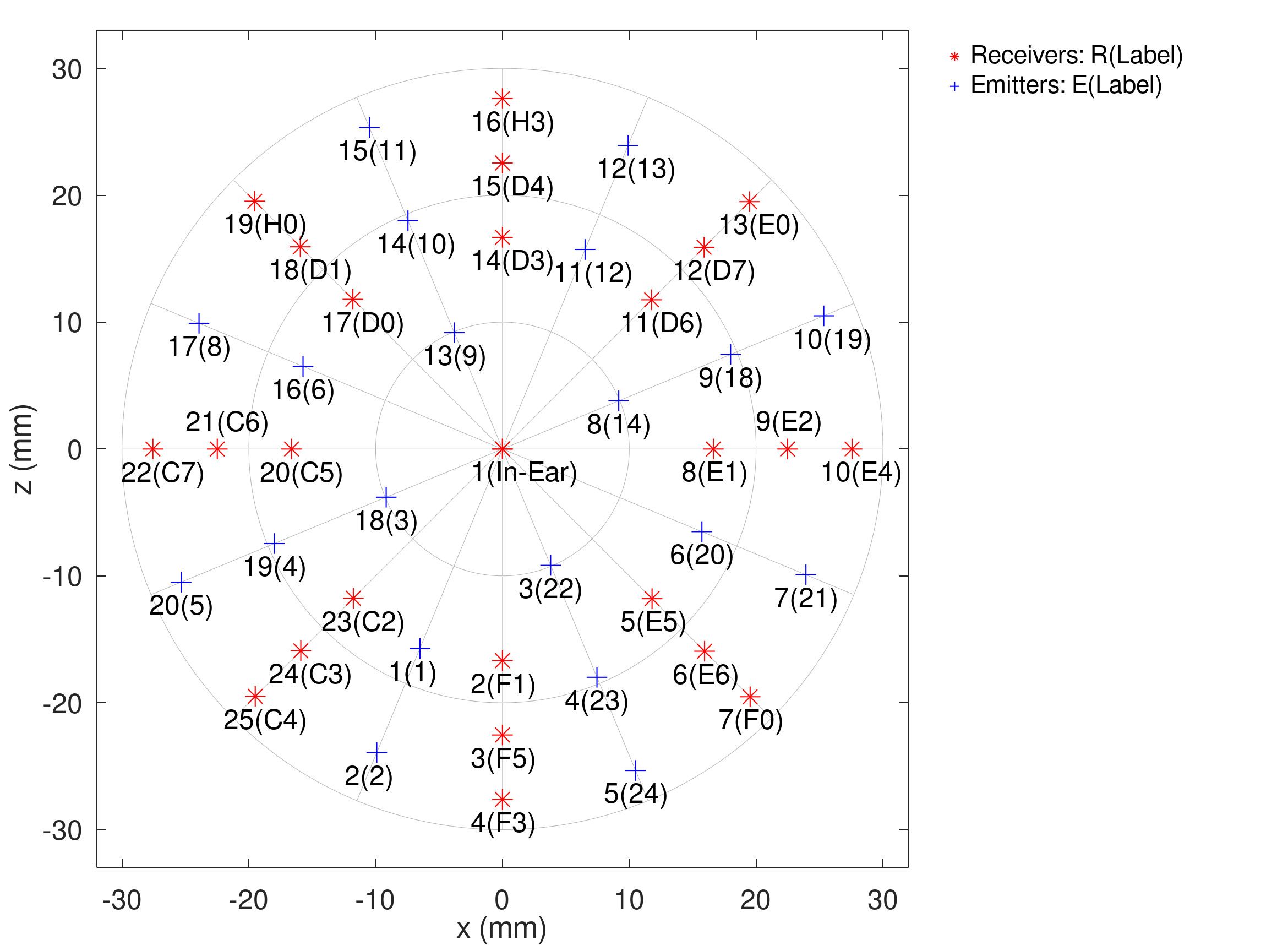 | Note: Sums of squared IRs at receivers (coloured dots) when one emitter is active (blue cross). The position of the in-ear microphone is indicative only as the actual position has not been recorded. |